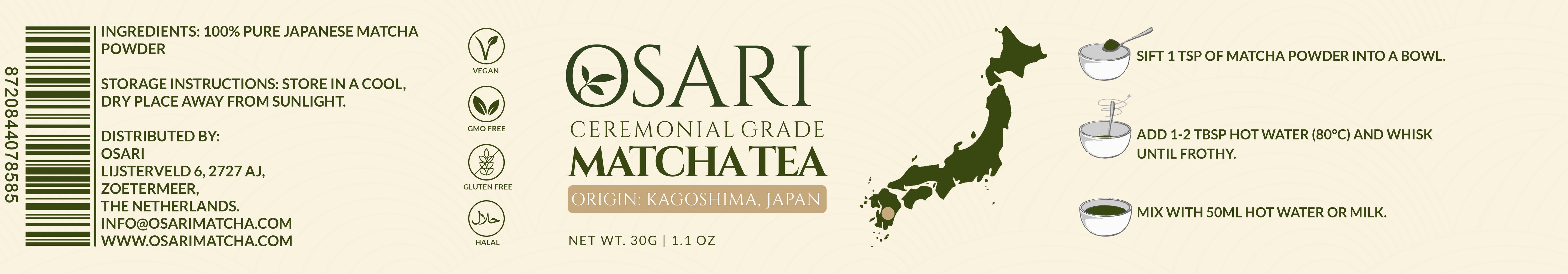 Each 30g tin is produced in small batches to preserve freshness, flavor, and nutritional integrity. Whether enjoyed traditionally or blended into modern recipes, OSARI offers an authentic Japanese matcha experience with uncompromising purity.